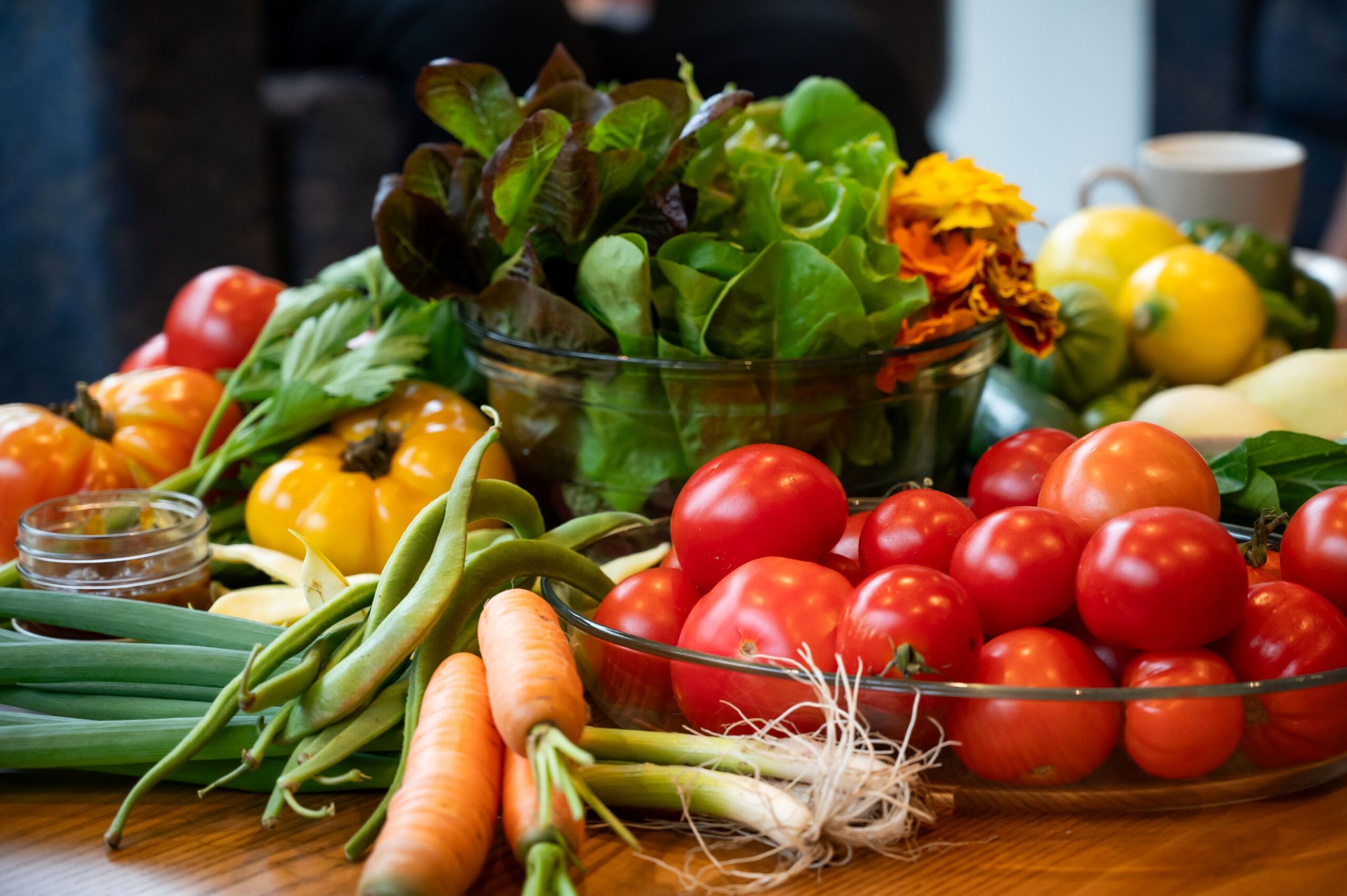 Laid out on the table is the harvest – beans, herbs, tomatoes, greens – gathered earlier and arranged with a kind of quiet pride. It’s generous and colourful, the sort of spread that makes people lean forward in their chairs. Someone comments on how good it looks. Someone else laughs and says it almost seems too nice to touch.