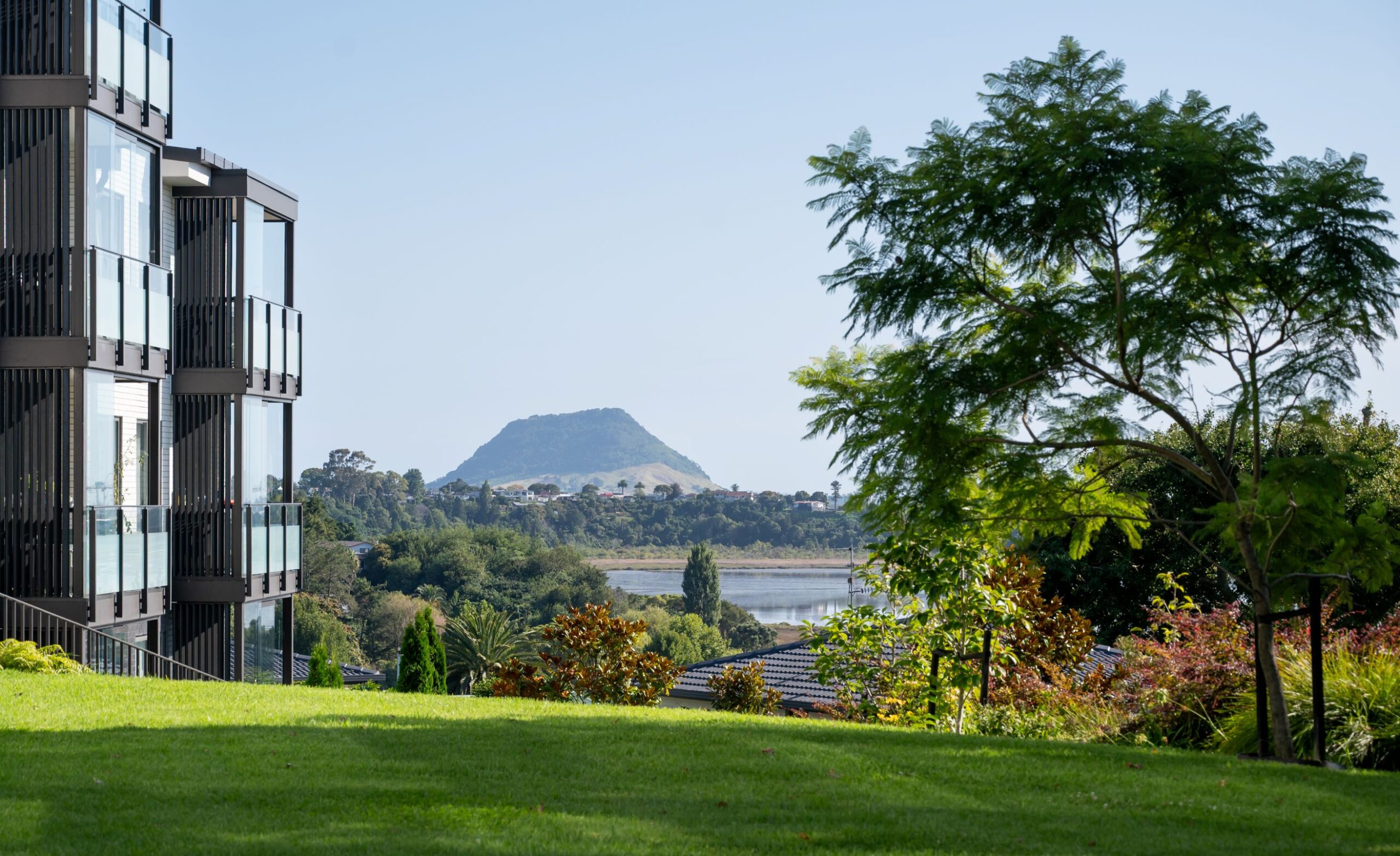 The sun is glorious. We pause to take in the view across the harbour, the Mount sitting clearly in the distance. As we move further through the village, cicadas hum and birds move through the trees. The landscaping is lush and layered – dense planting, established trees, pockets of shade – alive with flora and fauna and clearly central to how the place feels.