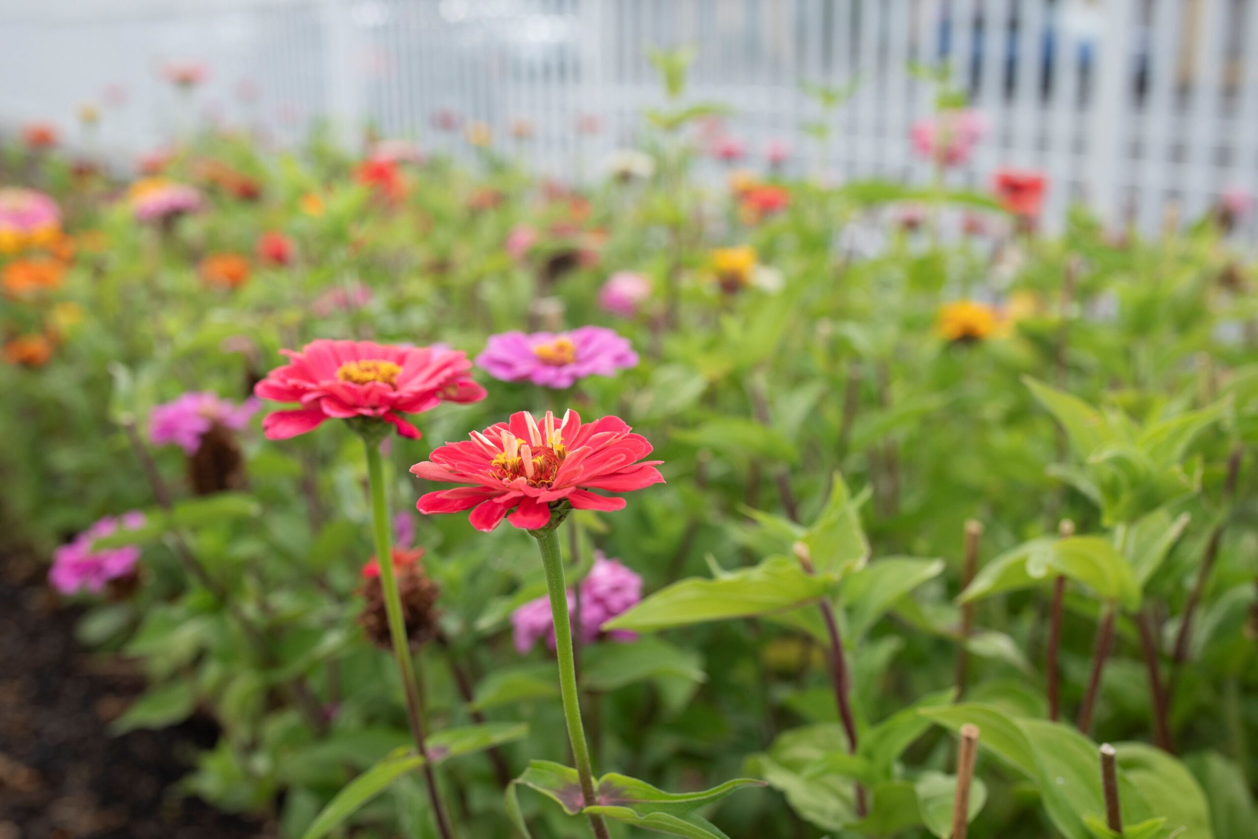 Let’s start with the zinnias, which begins with 800–900 seedlings planted each November. Aside from a beautiful welcome to the school, Murray says everyone uses and enjoys them, as the more you pick, the more they flower.