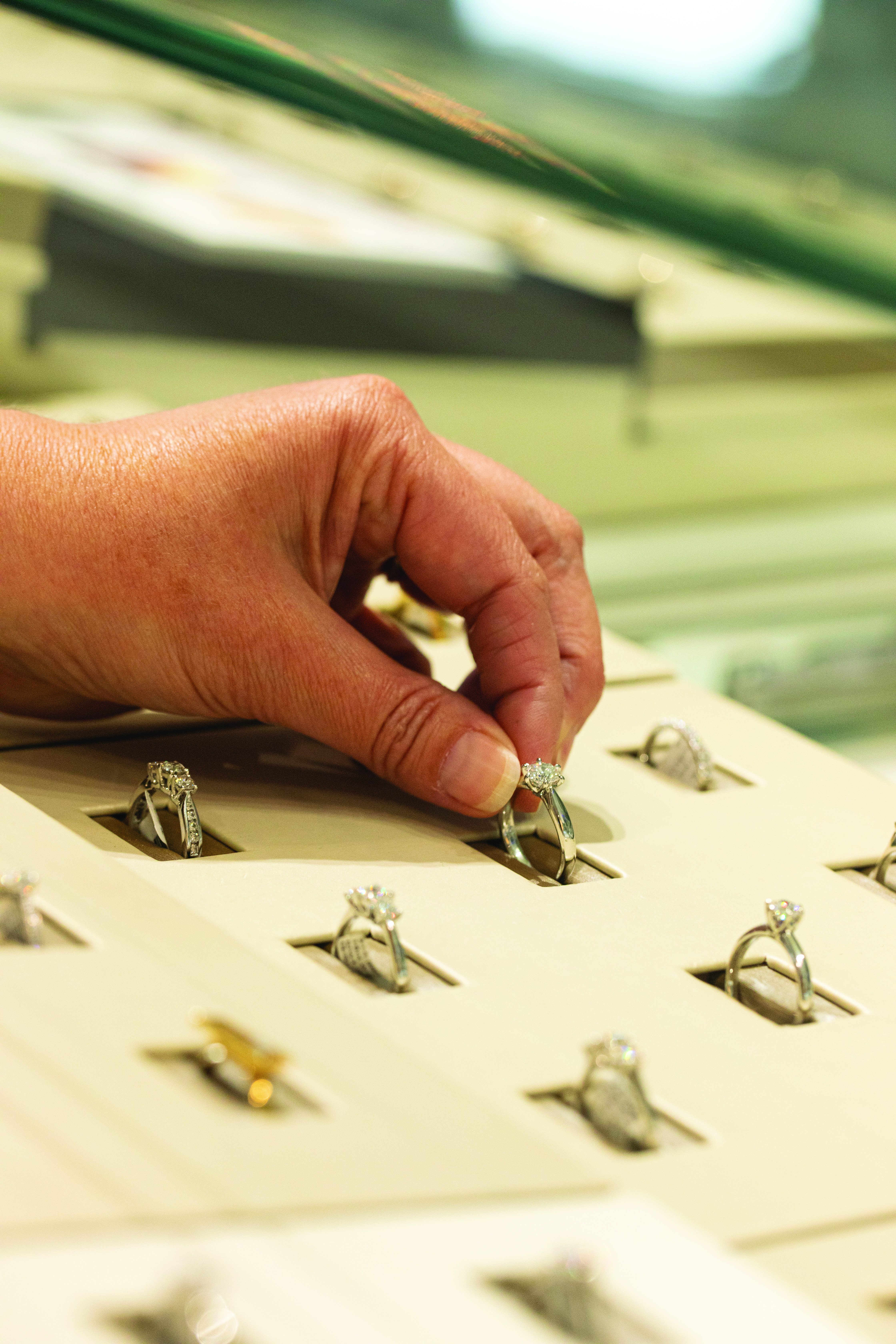 Paul shows some of the diamond rings he has designed and custom-made, including a dramatically pointed marquise-cut diamond, a classic solitaire, and a cluster setting, all of them shining in his showcases.