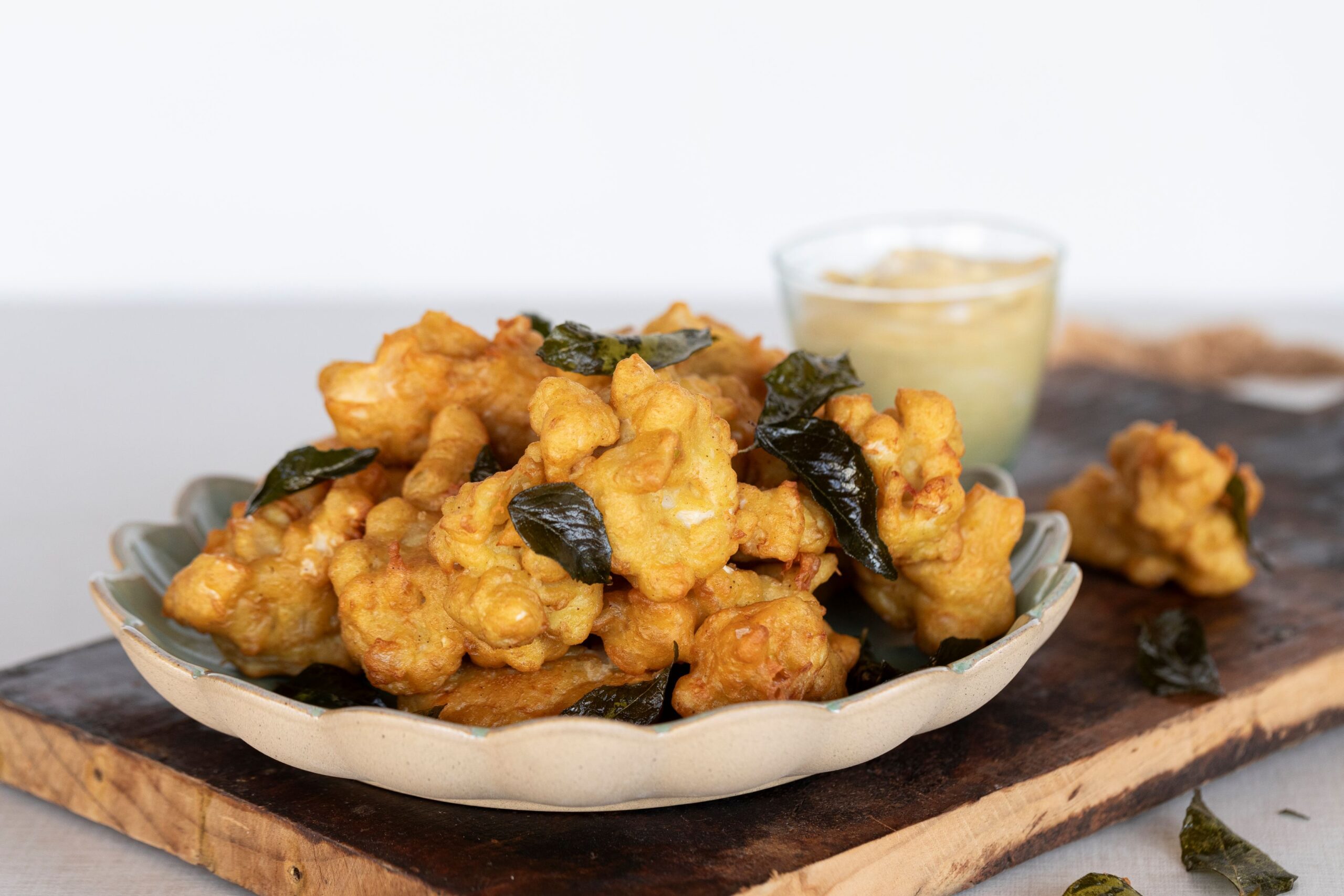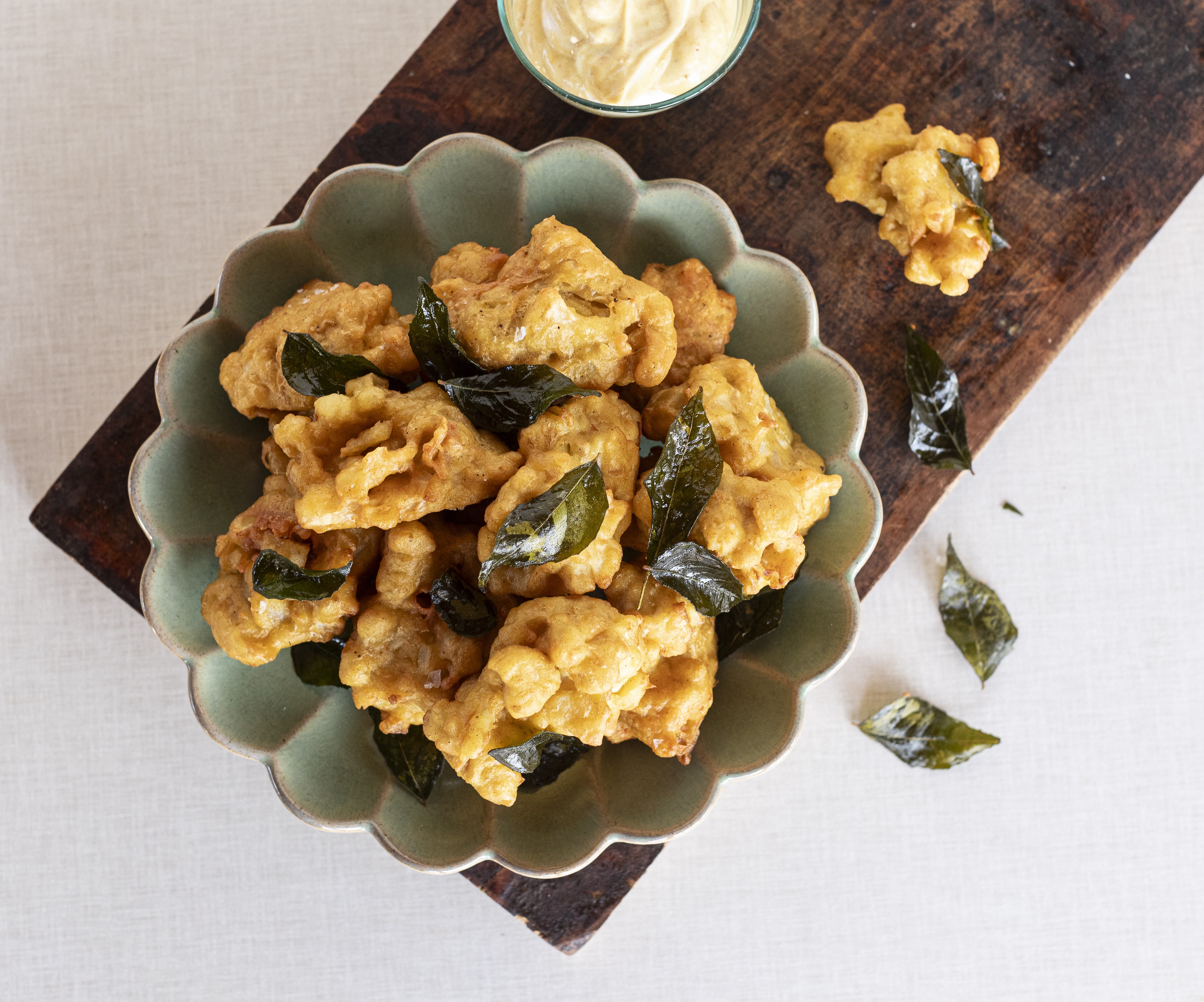 Heat the oil to 180°C, adding some curry leaves in to flavour the oil. When the curry leaves have crisped, scoop these out with a slotted spoon and place on some paper towels to drain. In batches carefully drop tablespoonfuls of the fritter mix into the oil and cook until golden brown and floating to the top. Drain cooked fitters on the paper towels and season with some flaky salt.