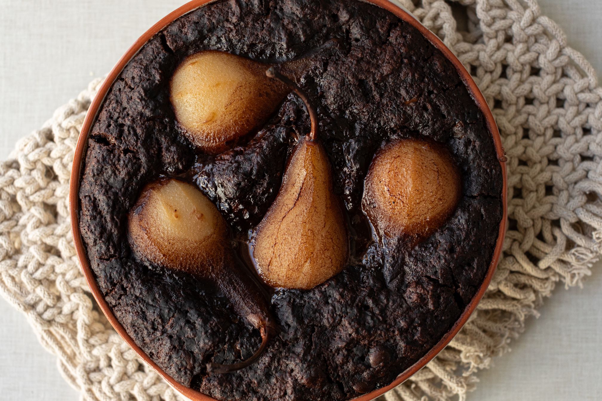 Spread into a greased baking 1.5 litre baking dish. Press the poached pears on top.