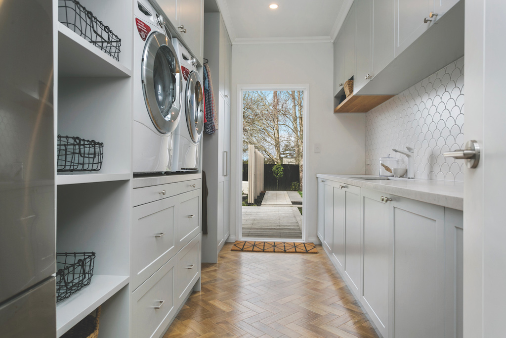 Like in a kitchen, ergonomics are key to a successful laundry layout. See here how the washer and dryer are placed above the bench, making it easier to reach in and out.