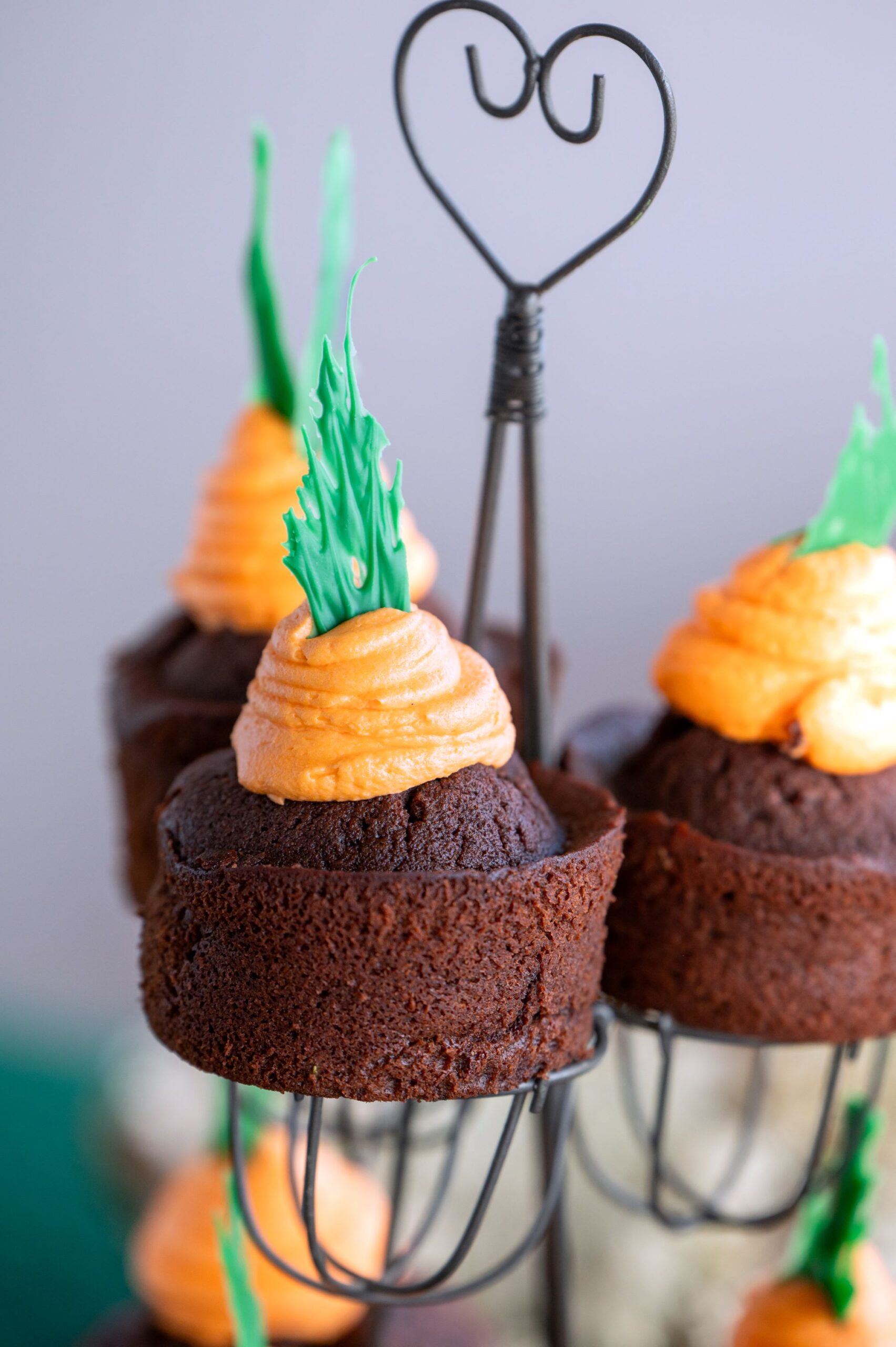 These cute cupcakes are Easter Bunny approved. They’re chocolate. They’re bright and fun. And they have a carrot piped on top!