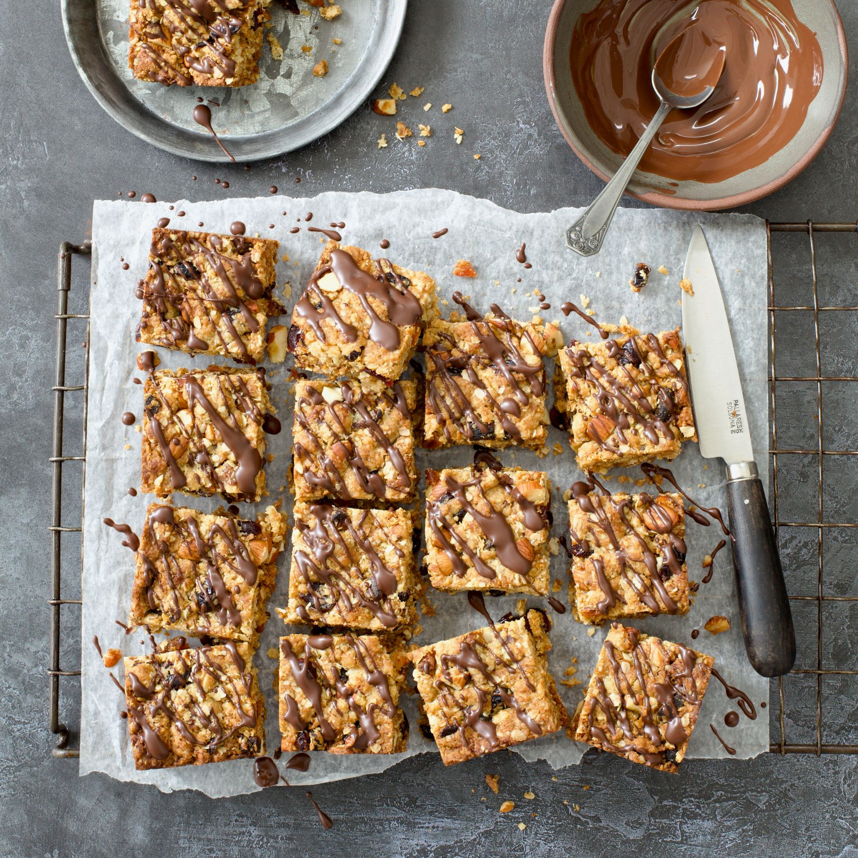 This loaded ANZAC slice, which is like one giant biscuit packed with extras of dried fruit and nuts, and topped with a drizzle of chocolate is a more decadent, modern twist on the traditional ANZAC biscuit recipe.
