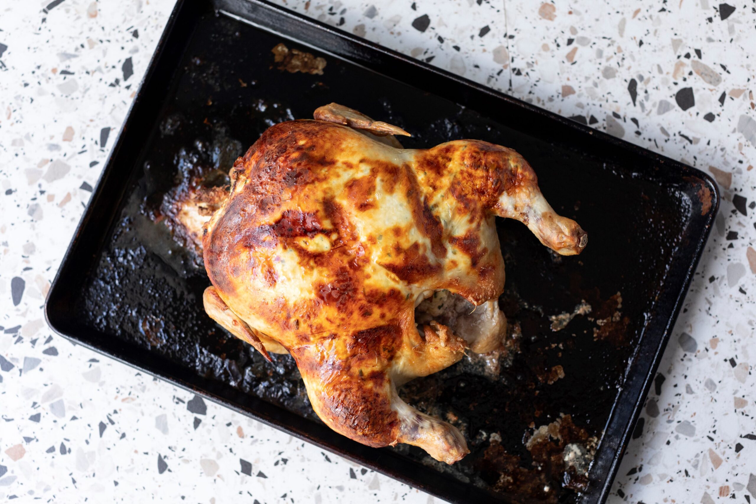 The game changer with this roast chook is that the ‘stuffing’ is not in its cavity but under the skin, creating a beautifully moist and flavourful bird.