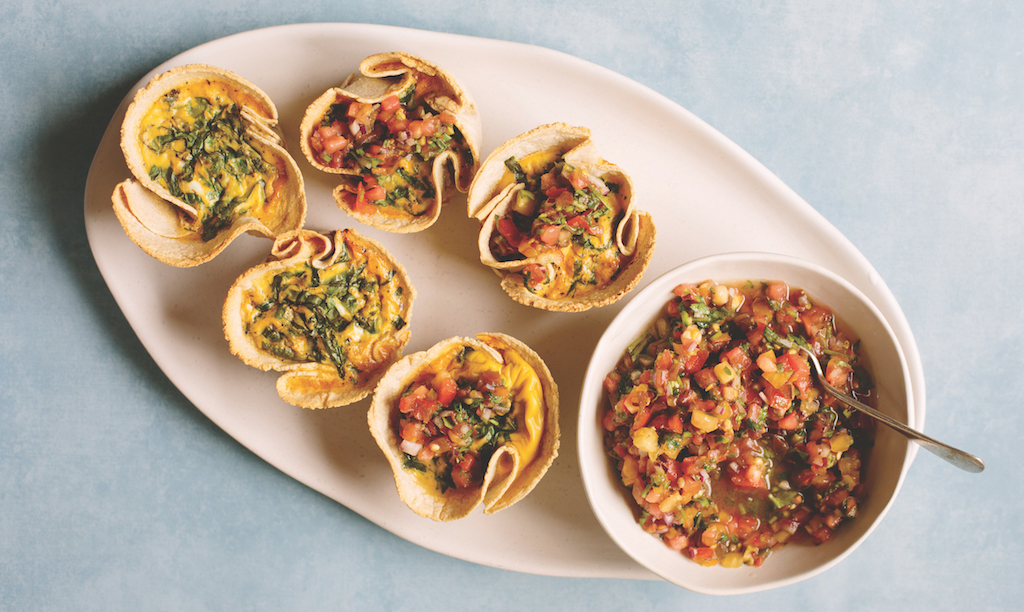 Whisk eggs and milk together. Add herbs and season well with salt and pepper. Divide evenly between tortilla cases and bake 20–25 minutes or until crispy on the outside and cooked through in the middle. Remove from the oven and set aside for 5 minutes. Run a knife around the edge of each to loosen and then gently tip out each one. Serve warm topped with a little salsa.
