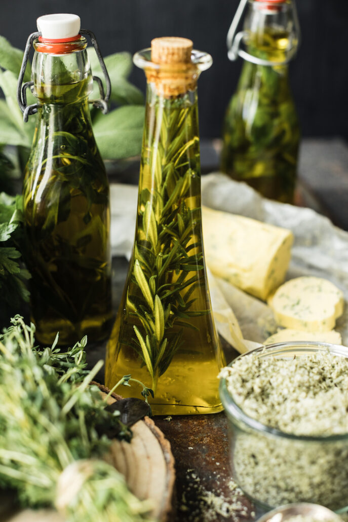 HERB OIL – this is ridiculously simple! Wash and dry the herb you want to use. Basil, rosemary and French tarragon are my favourite. Place the herb in a sterilised bottle and then fill with extra virgin olive oil, ensuring the oil covers the herbs completely. Leave for a week or two (in a cool dark place) for at least two weeks before using.
