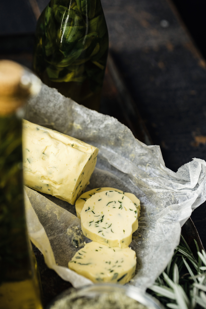 In the summer I have an abundance of more than just mint and rosemary and happily plenty of uses for the sage, thyme and basil that goes crazy. A great way to preserve these and create easy ways to capitalise on the flavour punch they provide is to make infused oils and butters.