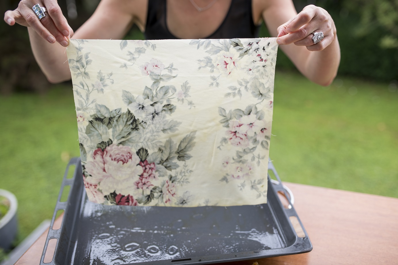 Place one fabric square onto your oven tray. You can line your tray with tinfoil to protect it, but to save waste I just wipe mine clean with a paper towel whilst the wax mixture is still hot.