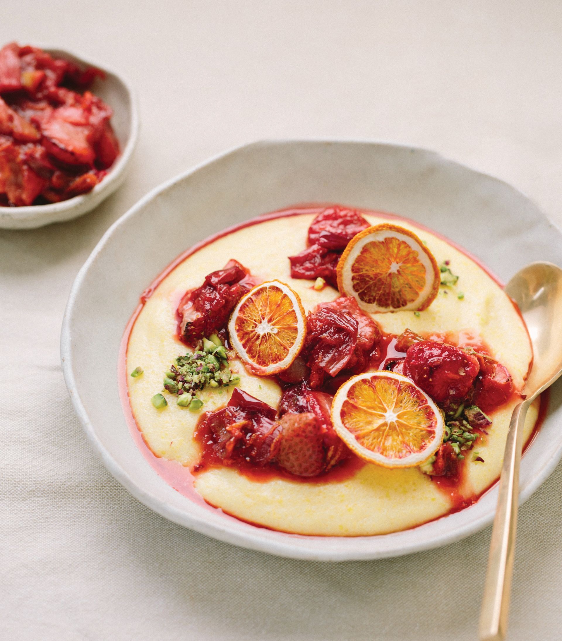 Divide between two bowls, top with dollops of compote and a sprinkling of chopped pistachios and dried orange slices, if using. Serve immediately.