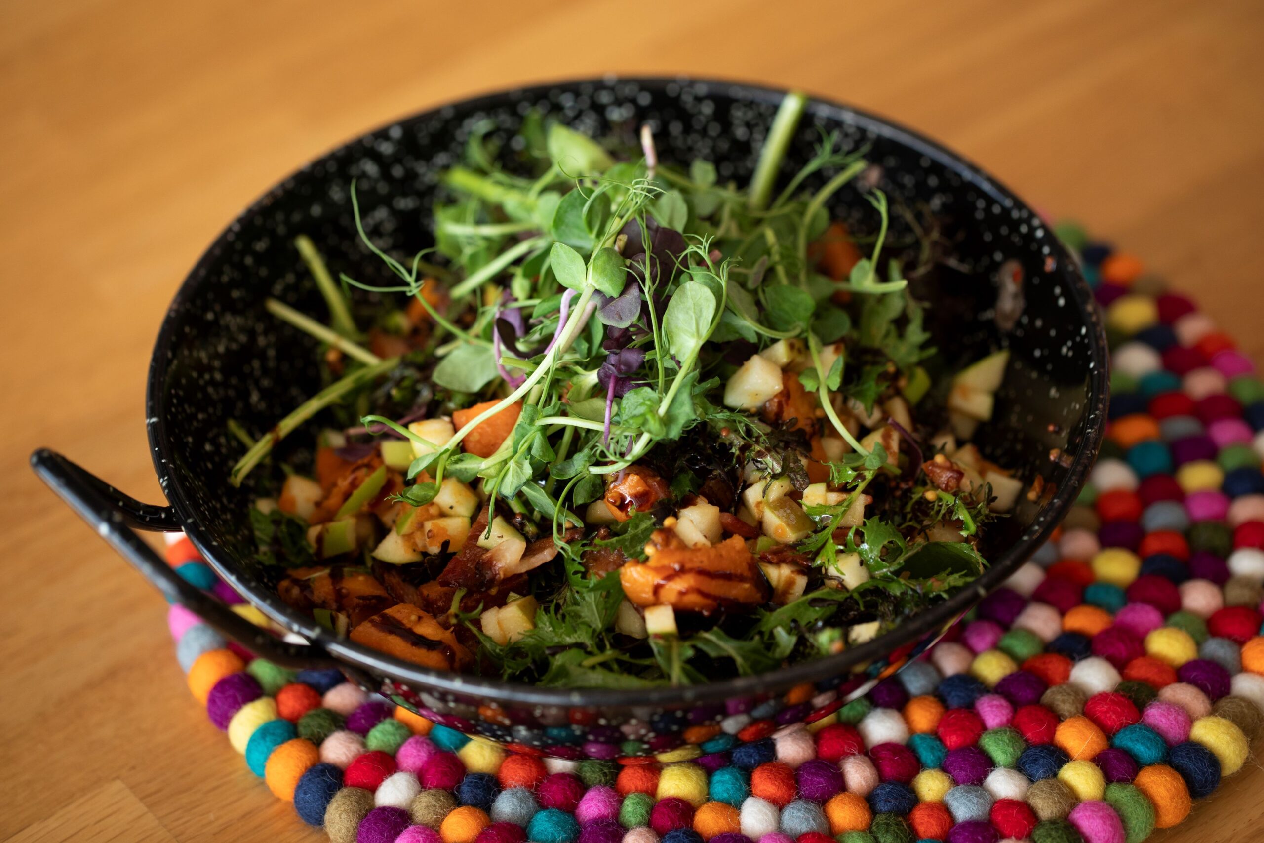 In a large bowl, combine mizuna, roasted kūmara, bacon, diced apple and pecans/walnuts. Drizzle with dressing and toss gently.