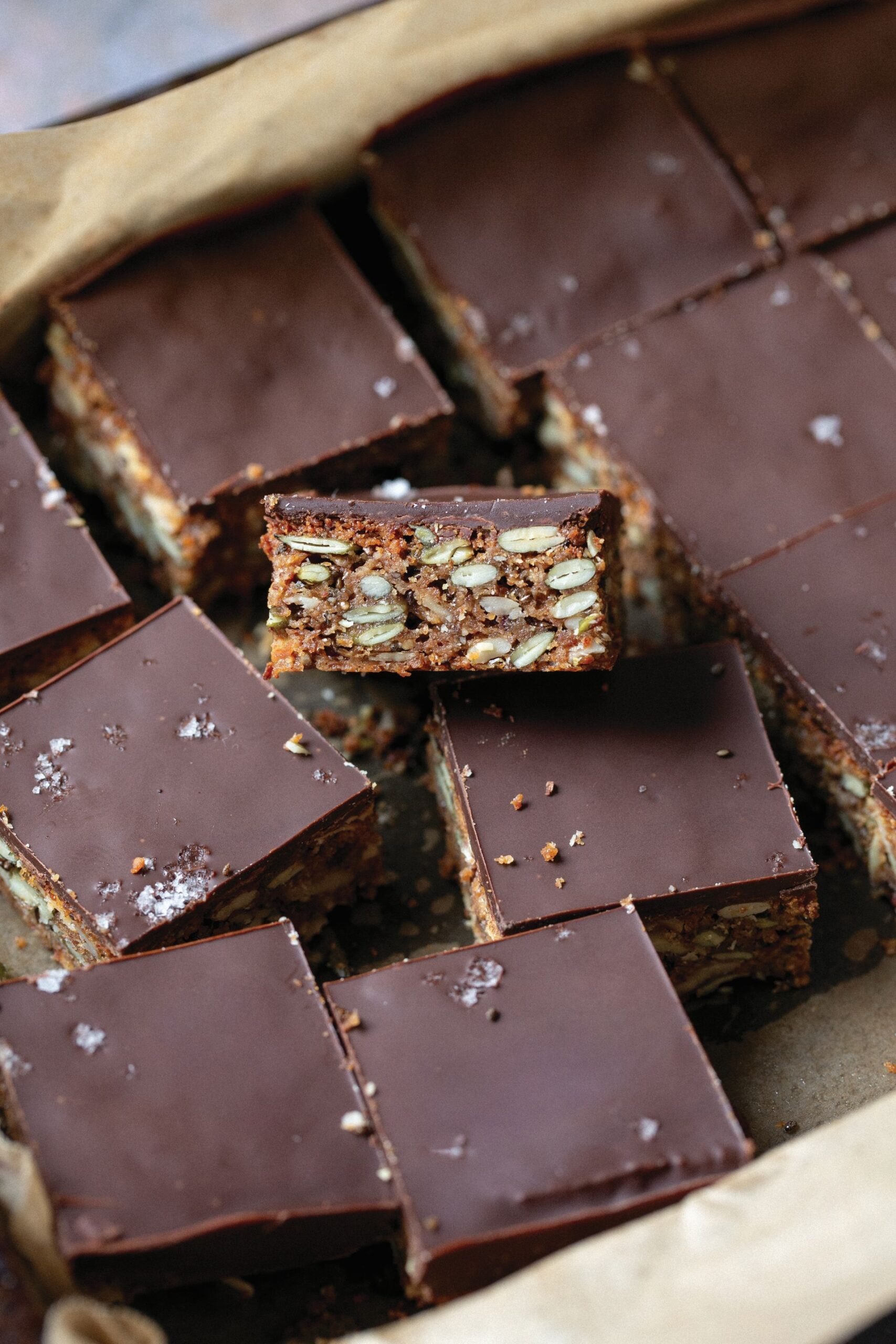 This slice is chock-a-block with seeds of every kind, mildly sweet and with just the right amount of chocolate on top. Feel free to swap around the seeds you use, just stick to the same amounts. Don’t like pumpkin seeds? Simply use more sliced almonds or sunflower seeds. Like hemp seeds? Add in a few tablespoons or swap out the chia for them. You’ll find brown rice malt syrup at most supermarkets in the health food section.