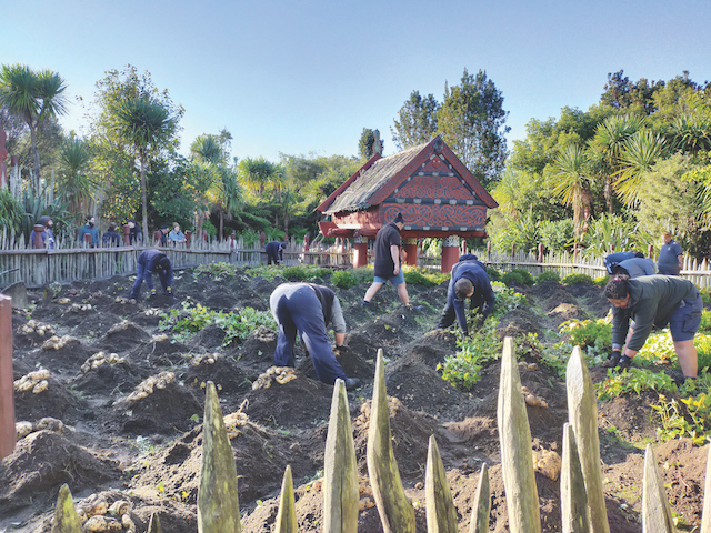 The Hamilton Gardens are almost empty of people at this time of day, but a few hardy souls are making their way towards one of Hamilton Gardens’ most important sites: Te Parapara. Te Parapara is New Zealand’s only traditional Māori productive garden and today is the day of the annual kūmara harvest.