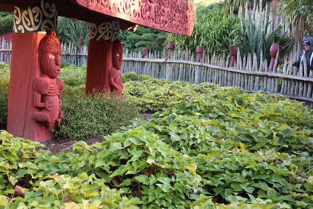 There are three traditional structures within the bounds of the garden traditionally used to store food: a pātaka, a whatārangi and a rua. They are all ornately and beautifully carved in the traditional style of the area.