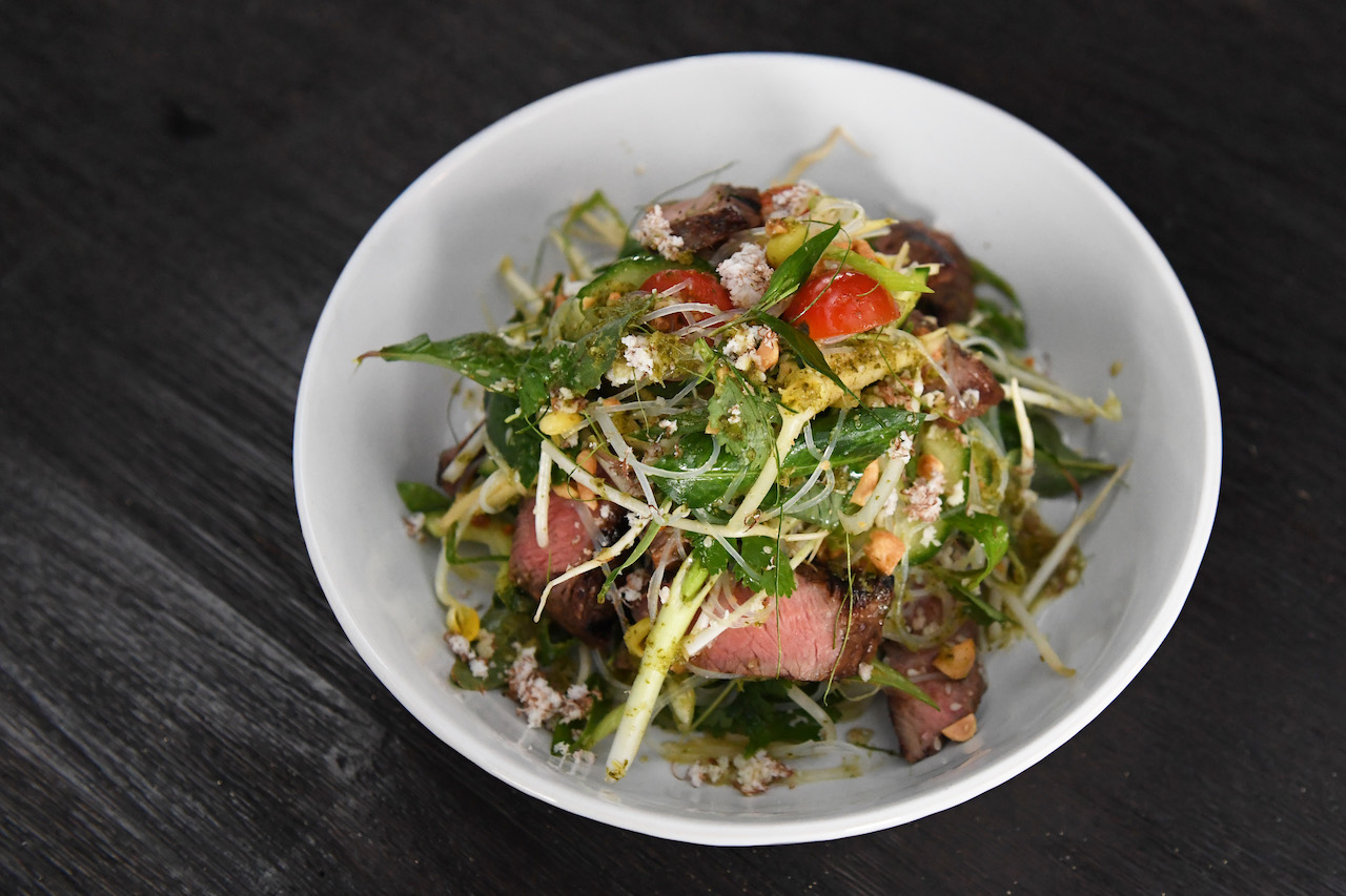 Slice the beef into 3mm thick strips and add to the salad. Dress with the Nam Jim dressing and serve immediately.