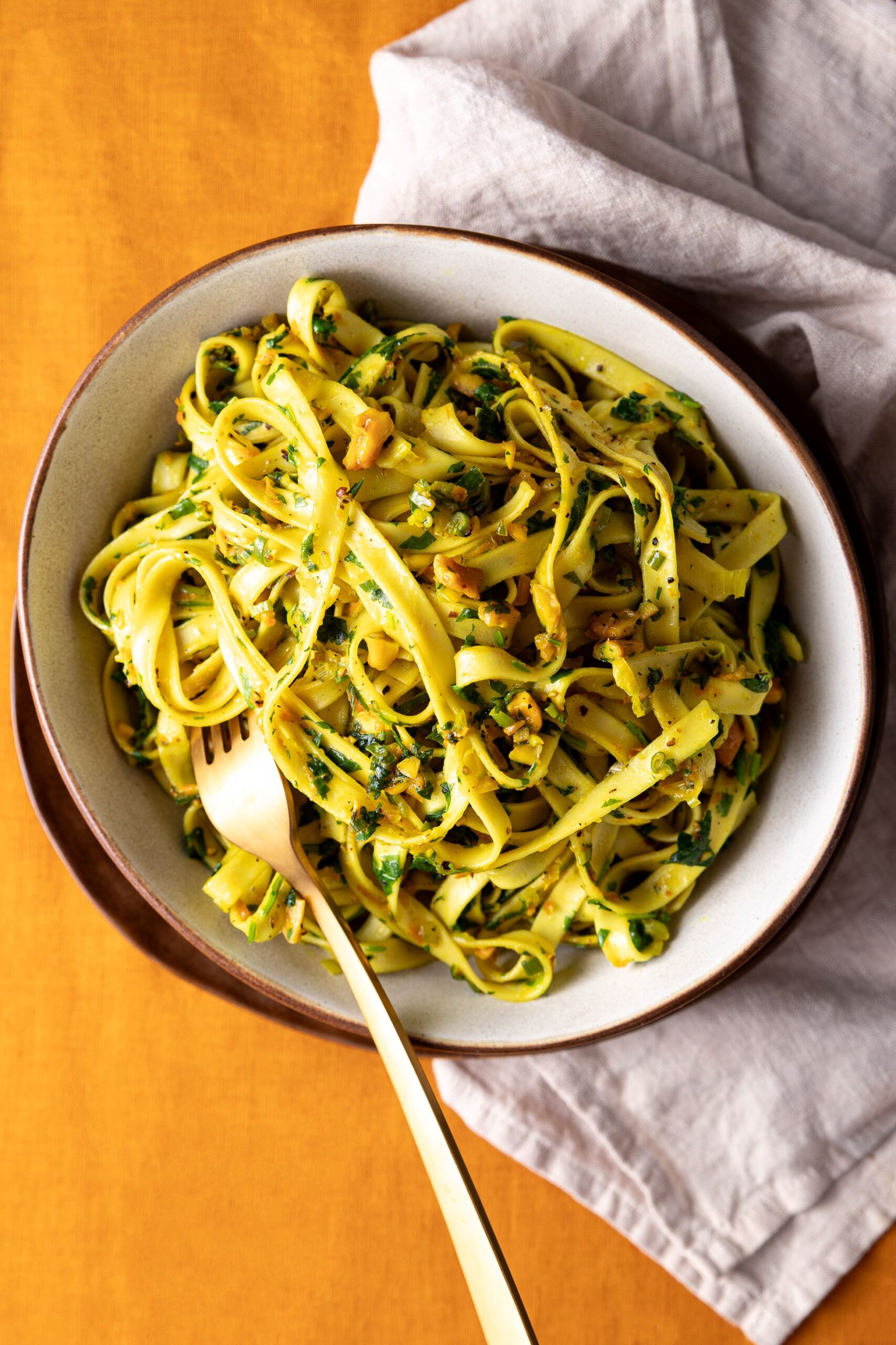 This simple noodle dish is inspired by the flavours of Vietnamese chả cá lã vọng, a traditional Hanoi fish dish that features turmeric, black pepper, garlic and dill. I actually couldn’t find dill anywhere, so used coriander instead and the result is a delicious, fragrant, vibrant yellow bowl of noodles that kind of gives Asian aglio e olio vibes (if you know, you know). Don’t skimp on the black pepper, this recipe uses a generous quantity as the spicy element. And of course, if you have dill, feel free to use it instead of coriander. This is very quick to make (it can be on the table in under 10 minutes) and makes a great lunch or light meal as it is, or consider adding some salt and pepper tofu (see note) and steamed greens to make it a complete meal. I used Chinese flat wheat noodles which are sturdy and work very well here. You could also use rice stick noodles for a gluten free alternative.