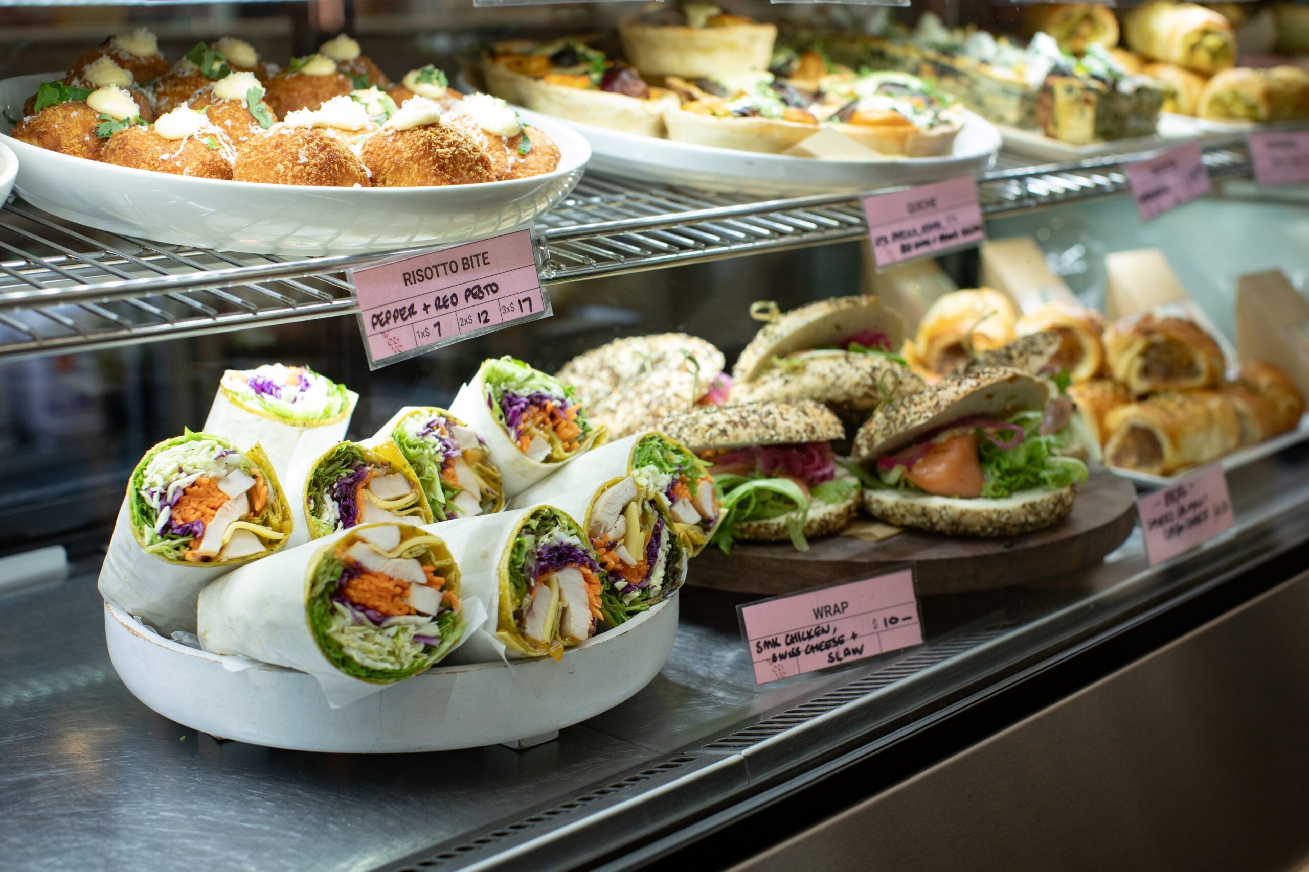 The cabinet is bursting with baking and savouries, and almost everything is made from scratch in the kitchen. “We pride ourselves on that,” says Tracey. There are top-selling cheese and rocket scones, blueberry and buttermilk scones, brownie, lemon oaties, passionfruit meringue slice, snickers slice, and blueberry lemon cheesecake. Much of this is the work of Emma Galloway, and Tracey says it’s a feat in itself to keep up with the demand.