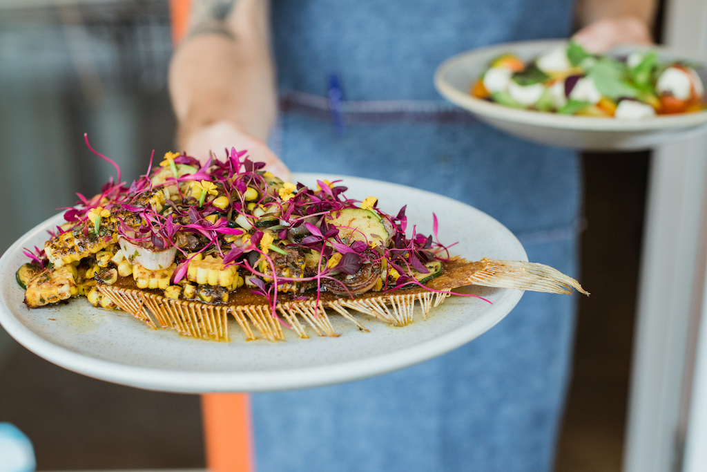 Turn heat back onto high for one of the same pans and throw in your shallots and roe if you collected any earlier, cook for 2 minutes or until shallots are soft. Then add 2 heaped tablespoons of bacon vinaigrette and cook for 30 seconds. Then add your corn and courgettes and cook for a further 2 minutes, regularly moving the veg around until the courgette just starts to soften. Take off the heat and add in your tarragon and season with a little bit of salt. Spoon the veg mix over your fish and serve with a couple of lemon wedges.
