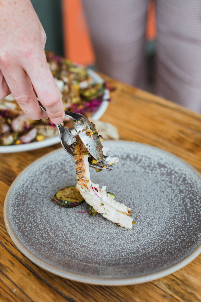 To check the fish is cooked, pull some meat off the bone with a spoon. If it flakes away easily it’s done. Remove fish from the pans and put onto your plates.